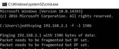What did we do – we sent a ping to another address –f tells ping to not allow fragmentation of the packet and –l tells ping the size of the packet in bytes.