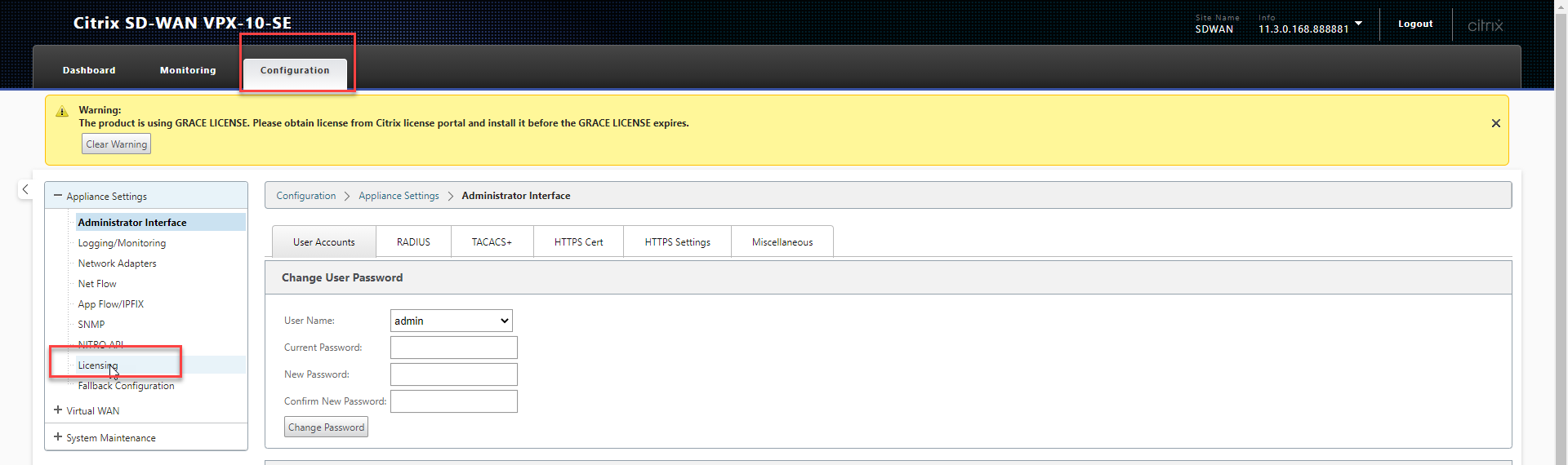 Select the “Configuration” tab at the top of screen. Select “Licensing” from the left hand menu.
