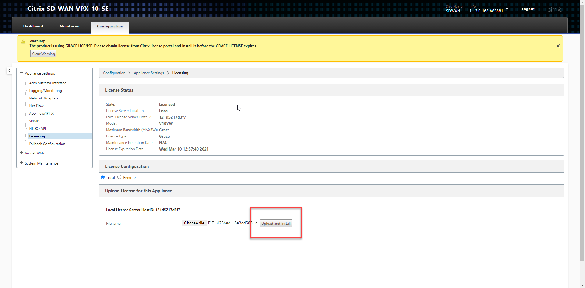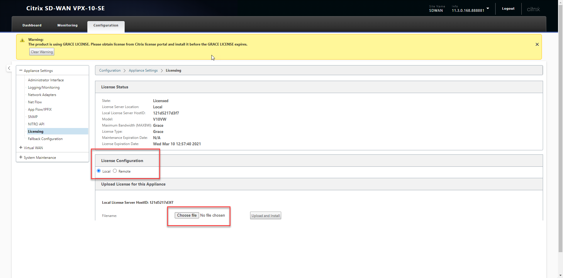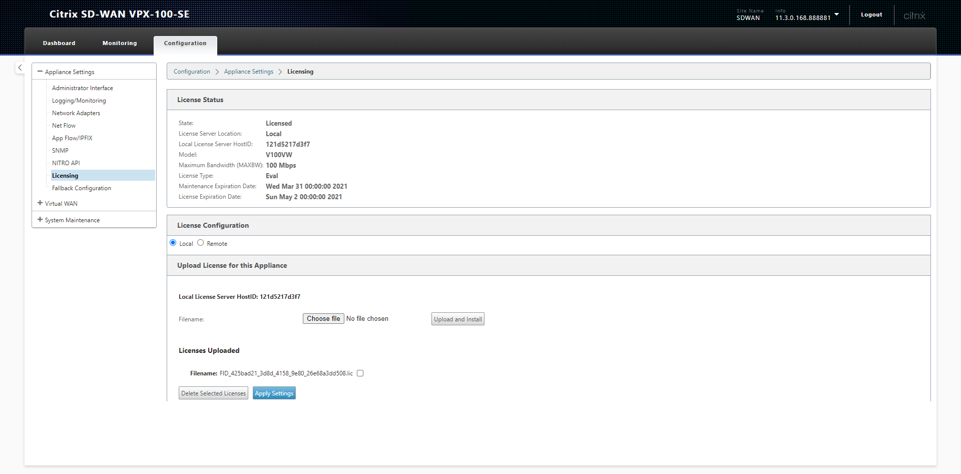 We’ll be using the local licensing server on the appliance. Select “Local” for the License Configuration and click “Choose File” to upload your license.