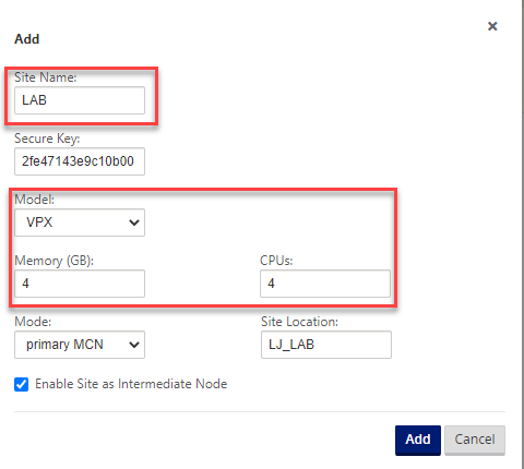 Select “+ Sites”. Add the Site Name, Select he model as “VPX”, Set the “Site_Location” and click “Add”.