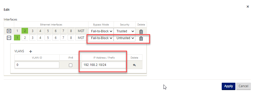 Set the interface to match the “Untrusted” connection we defined earlier. Set an IP address and gateway, Set the speed of the internet connection being used.