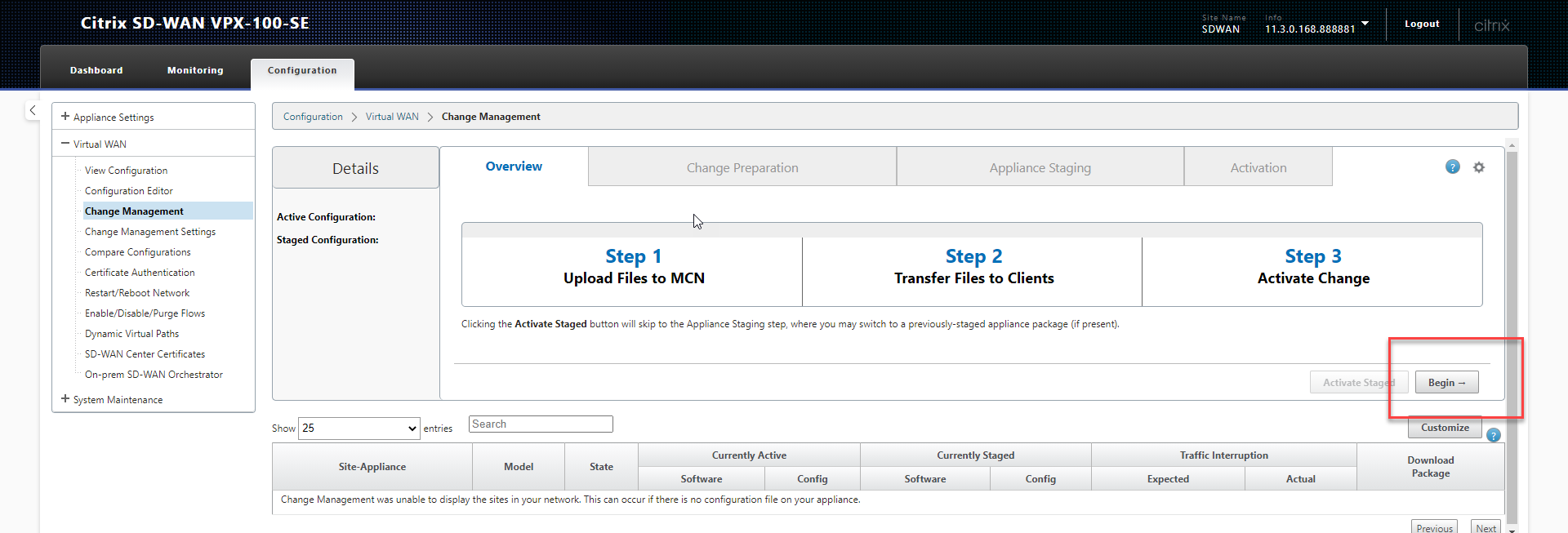 This area is where we centrally manage our configuration releases to all SD-WAN appliances that we are managing. Select “Begin” to push the configuration we just made to the Master Control Node.
