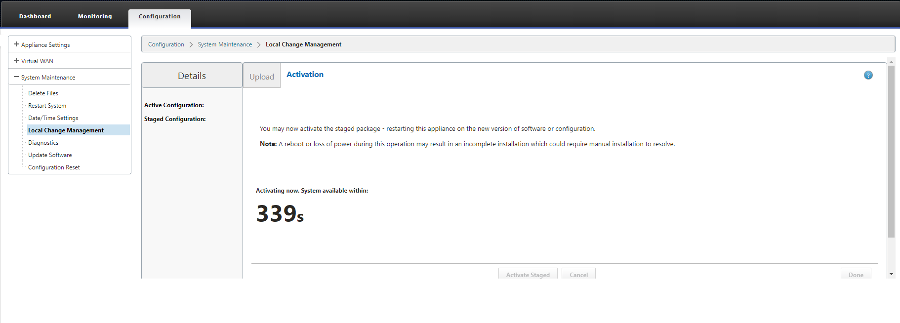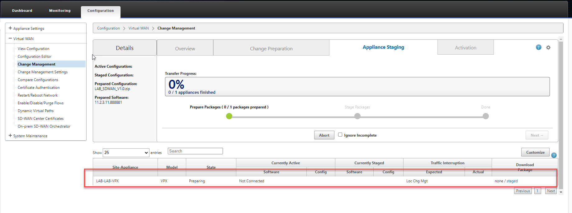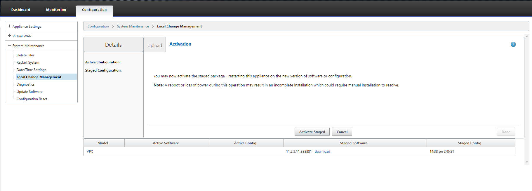 Now we are at the point where we can activate the staged configuration. We’re at the point where the appliance has the configuration but its not active. Select “Activate Staged”.