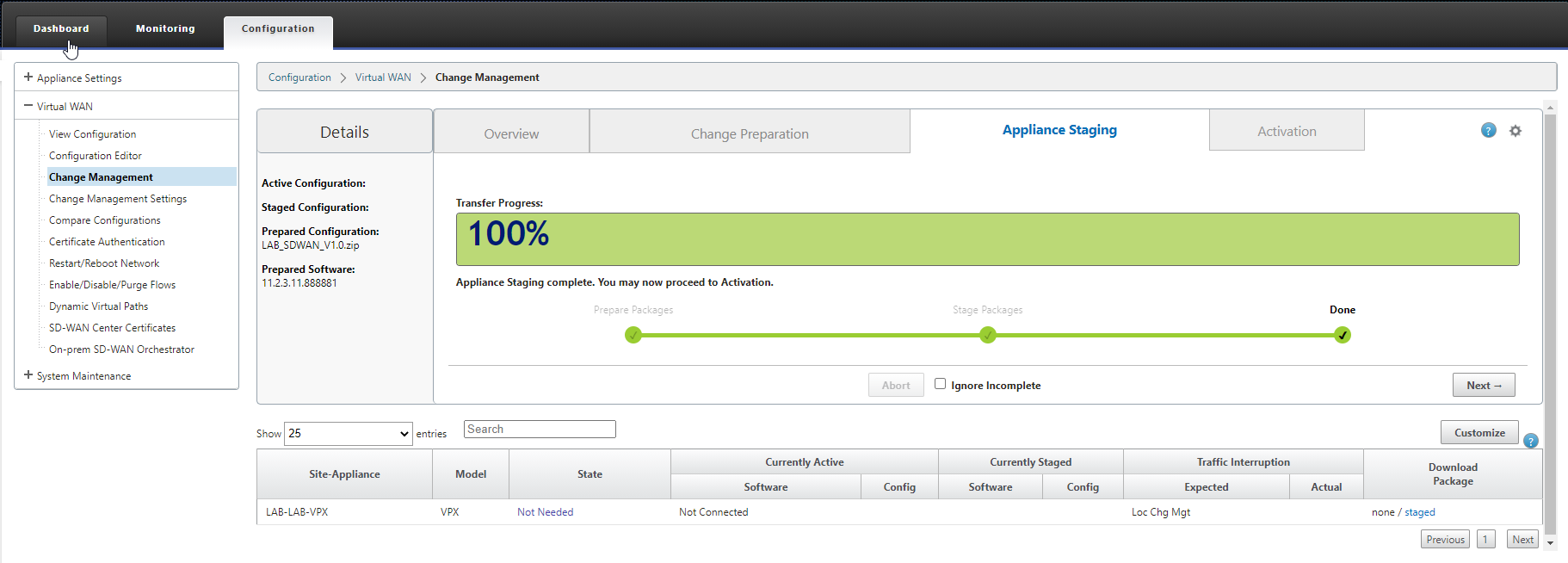 Once the package has been prepared (Its essentially a zip file with the appliance configuration in it) and sent to the appliance (This time its our MCN) we will be able to select “Next”.
