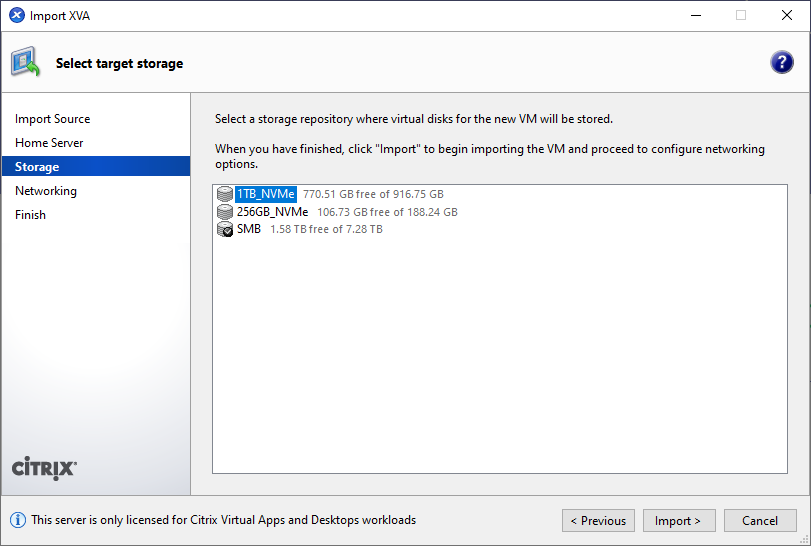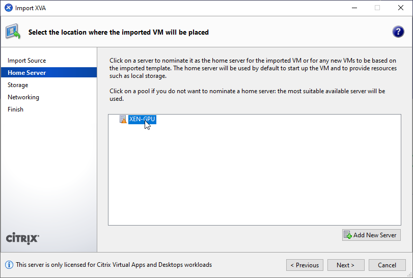 Pick your XenServer to import the appliance too if you have more than one. Select “Next”.