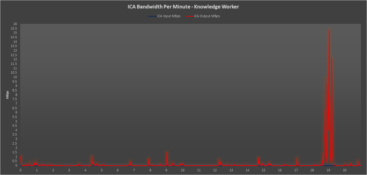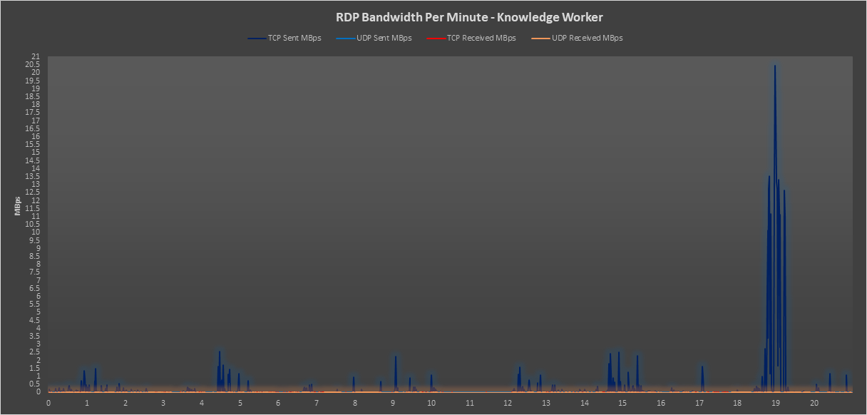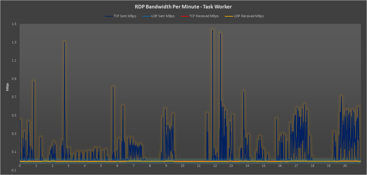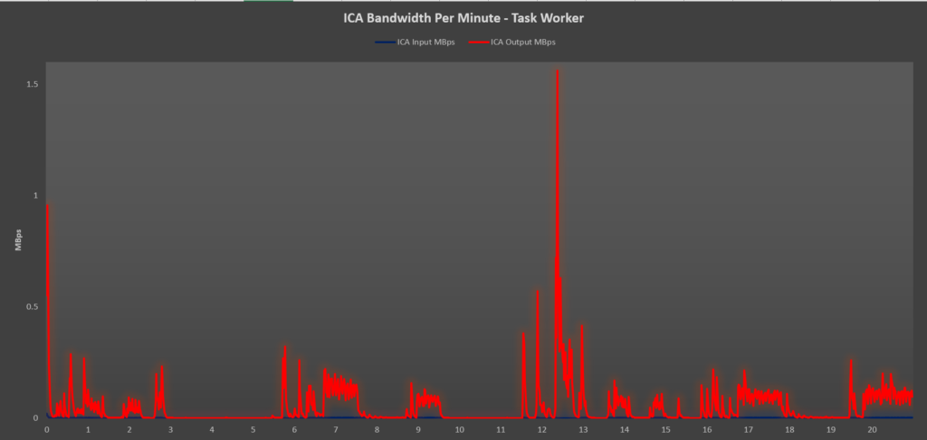 You can see here that the RDP bandwidth on the Task Worker profile doesn’t really peak above 1.5 MBps during the workload. Most modern internet connections would handle this scale of demand without too much of an issue.